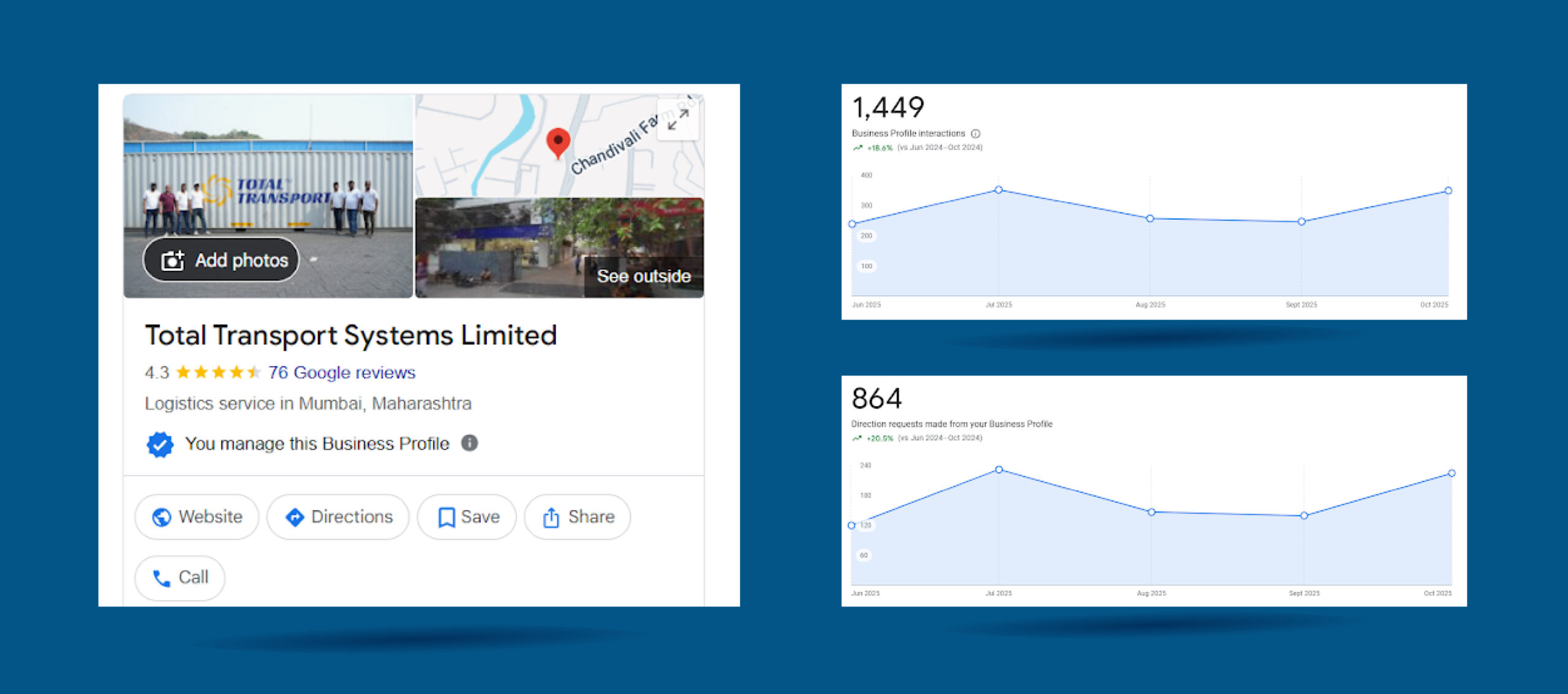 Strong GMB performance driving steady visibility, meaningful interactions, and high-intent enquiries. 1.4K GMB Visitors Quarterly | 860+ Interactions | 200+ Calls